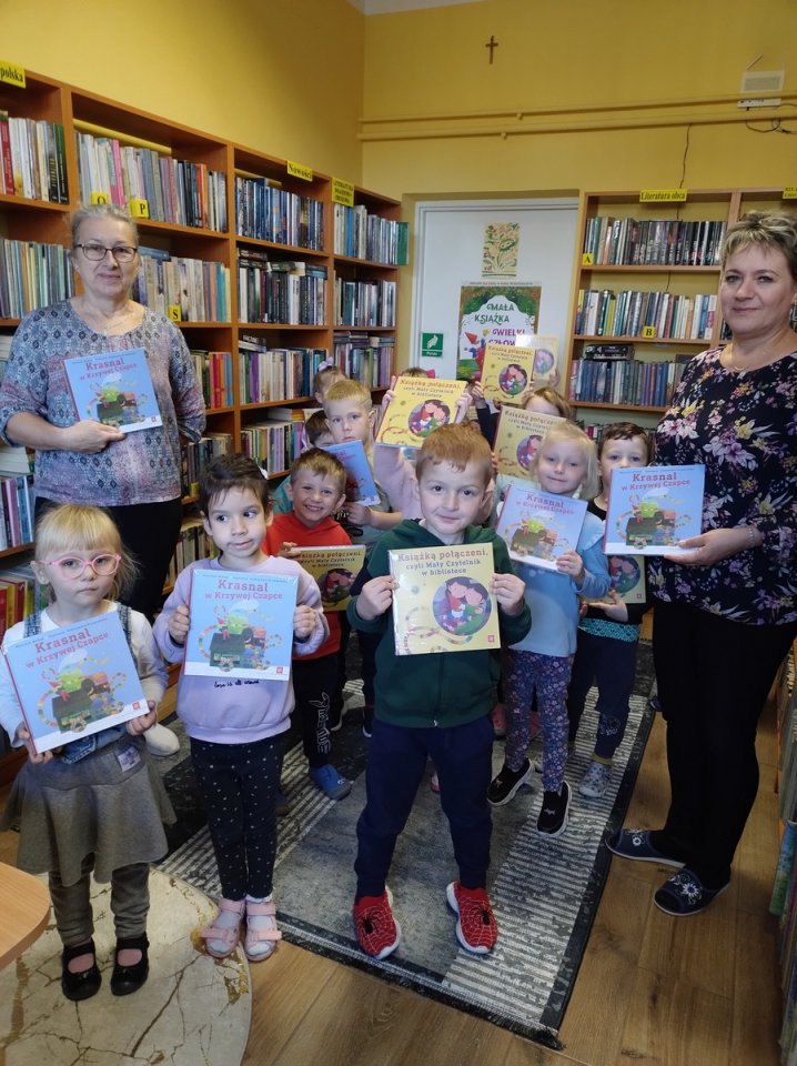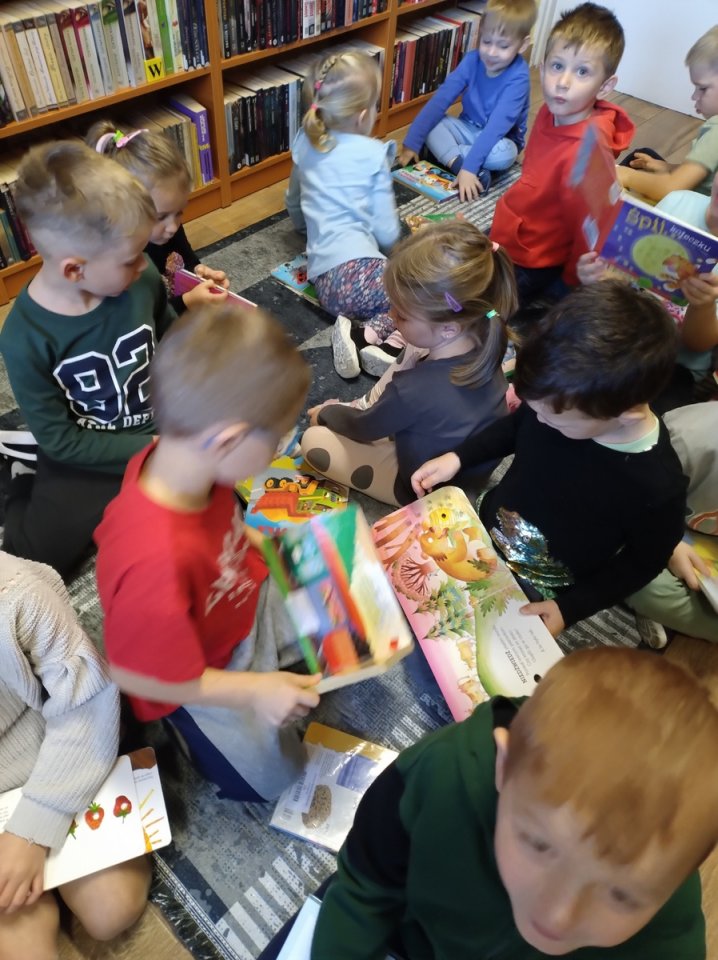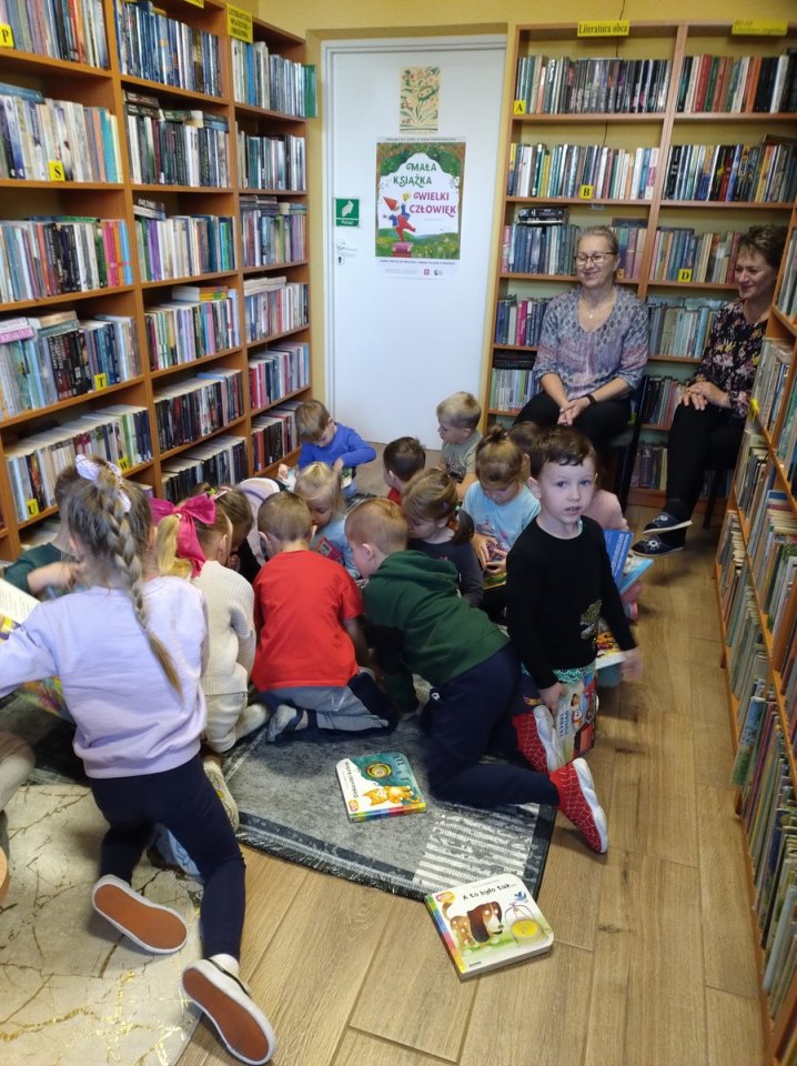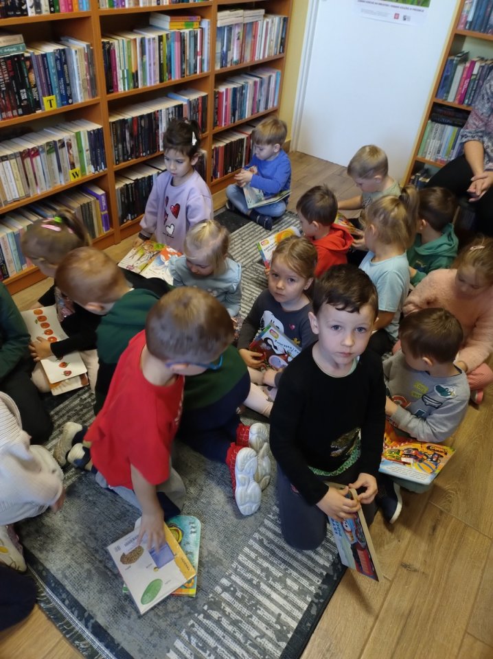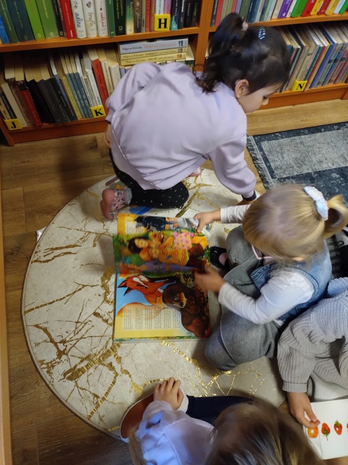 Głównym tematem spotkania była książka i biblioteka. Dzieci zapoznały się z zasadami wypożyczania książek oraz funkcjonowaniem biblioteki. Później przedszkolaki słuchały czytanych bajeczek o różnych zwierzątkach oraz z wielkim zaciekawieniem oglądały wybrane bajeczki. Na koniec spotkania wszystkie dzieci otrzymały książeczki, kolorowanki i słodycze.